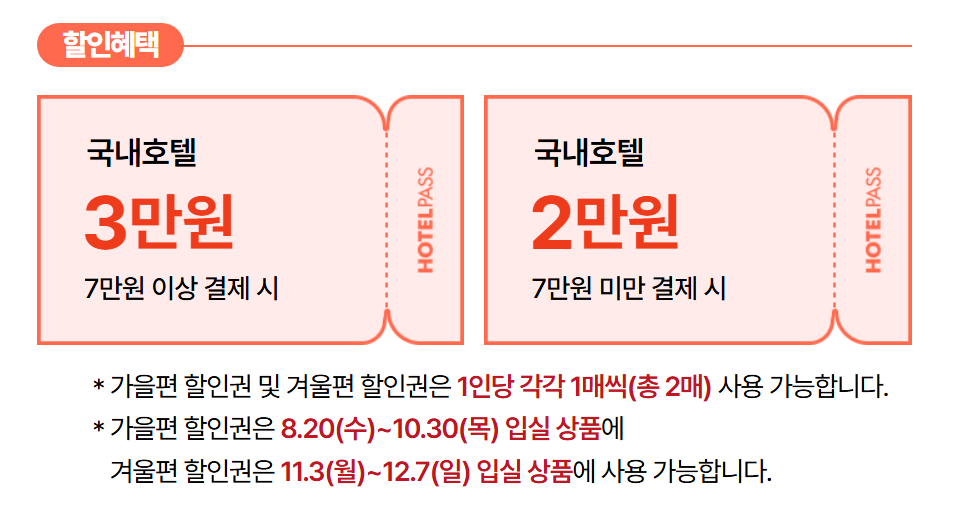 숙박대전의 가장 큰 장점은 당연히 숙박비 할인 혜택입니다. 행사 기간 동안 발급되는 쿠폰은 2만 원권과 3만 원권으로 준비되어 있으며, 주중과 주말 모두 사용할 수 있습니다.