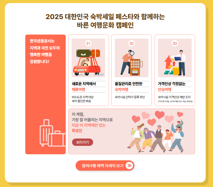‘숙박대전’은 여행객들에게 실제로 체감할 수 있는 혜택을 제공하는 대표 행사입니다. 가을편에서는 계절 여행의 즐거움을 한층 더 저렴하게, 특별재난지역 편에서는 여행을 통한 사회적 기여를 함께 누릴 수 있습니다.