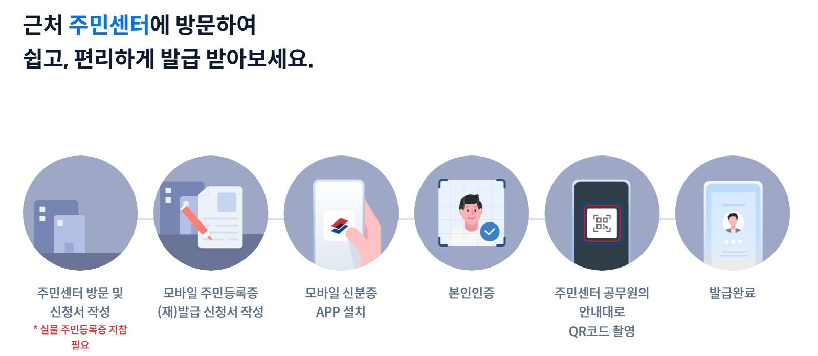 만약 IC 주민등록증이 없는 경우, 주민센터에서 모바일 주민등록증 발급 신청서를 작성하고, 앱에서 안내하는 QR코드를 스마트폰으로 촬영하면 모바일 주민등록증을 발급받을 수 있습니다.
