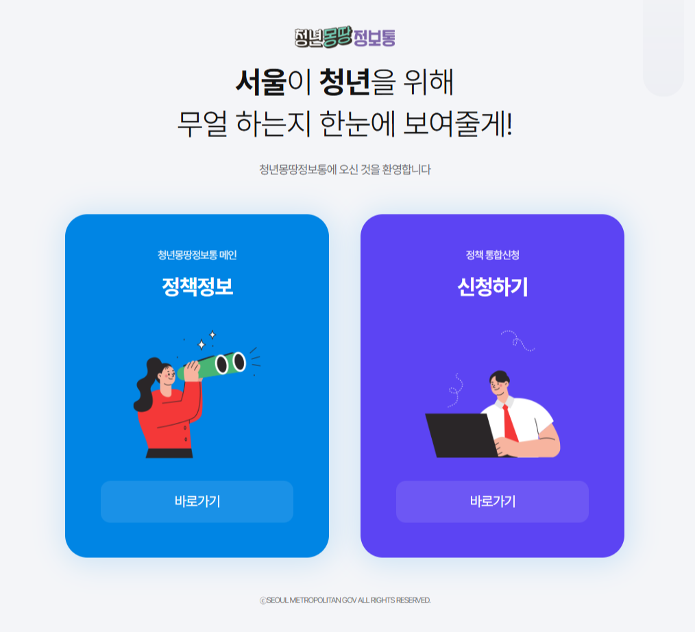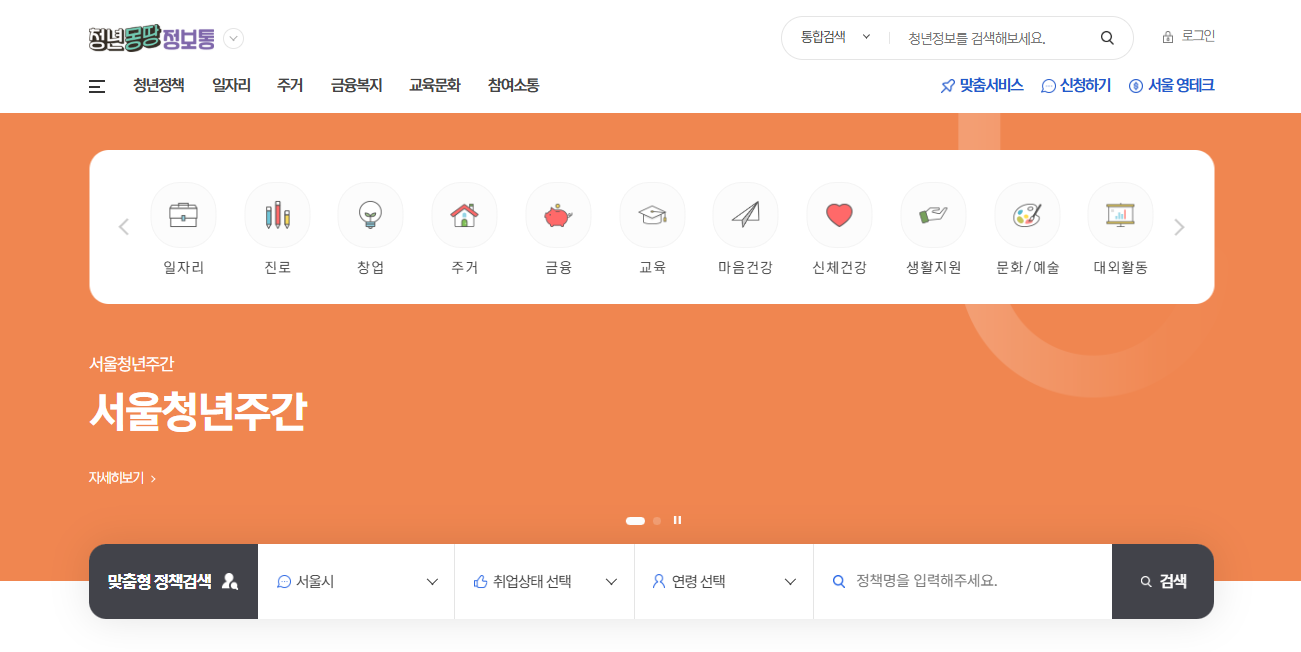서울시와 중앙정부를 포함해 약 2,000여 개의 청년 정책을 모아놓은 종합 창구로, 단순히 보는 데 그치지 않고 검색–확인–신청까지 한 번에 가능한 서비스라는 점에서 차별화됩니다.
