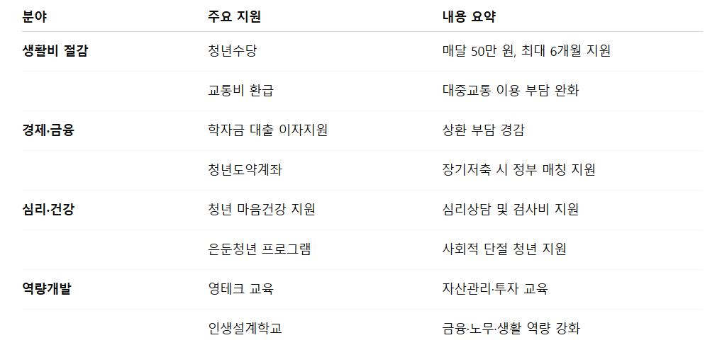 청년이 체감하는 생활비 절약, 심리적 안정, 미래 자산 마련에 직결되는 정책이 대부분이라 ‘혜택 놓치기 방지 플랫폼’이라는 말이 어울립니다.
