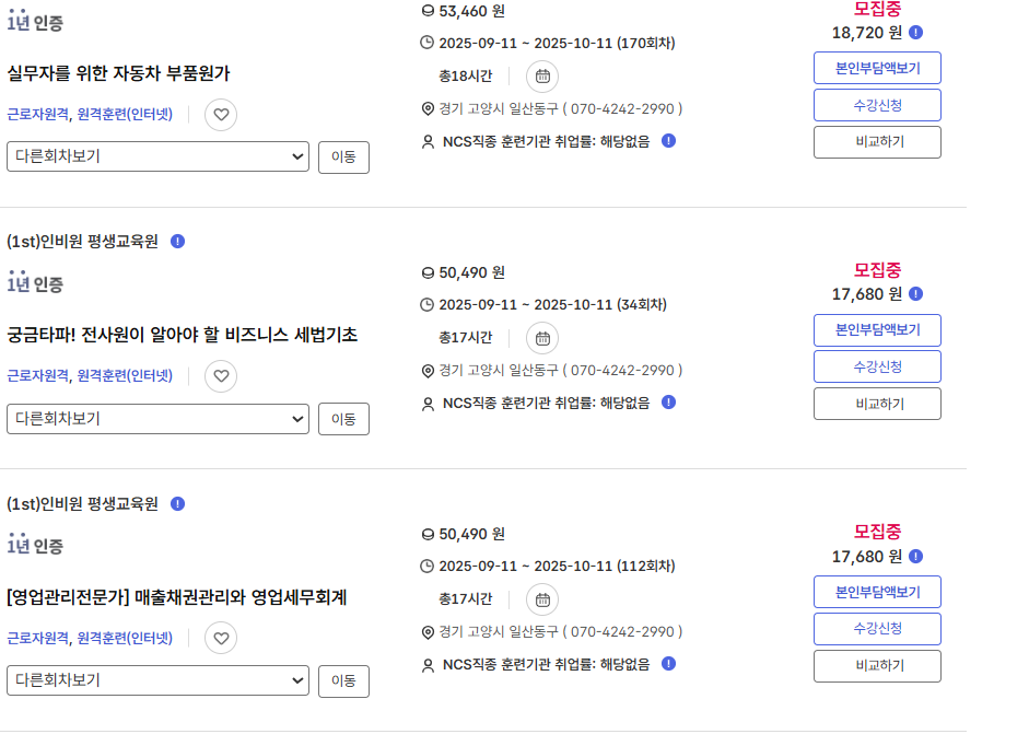 - 훈련별 자부담 비율(최대 45%)이 있으므로 반드시 확인해야 합니다.
