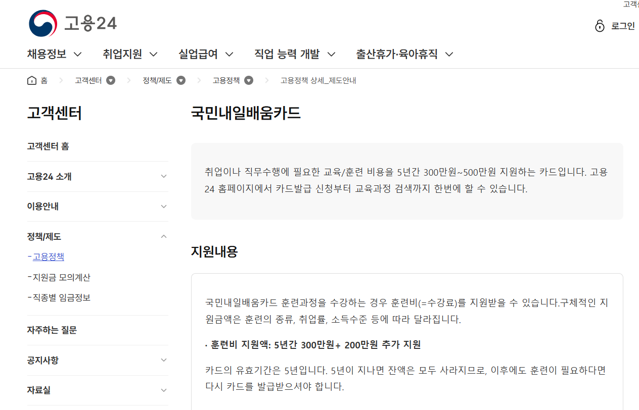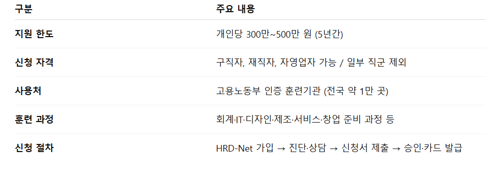 한 번 발급받으면 최대 5년 동안 사용 가능하며, 개인당 300만~500만 원 한도 내에서 직업훈련비를 지원받을 수 있습니다.