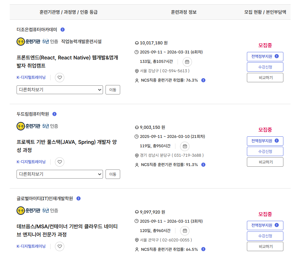 ● 훈련기관: 고용노동부가 인증한 전국 직업훈련기관 (약 1만 개 이상)