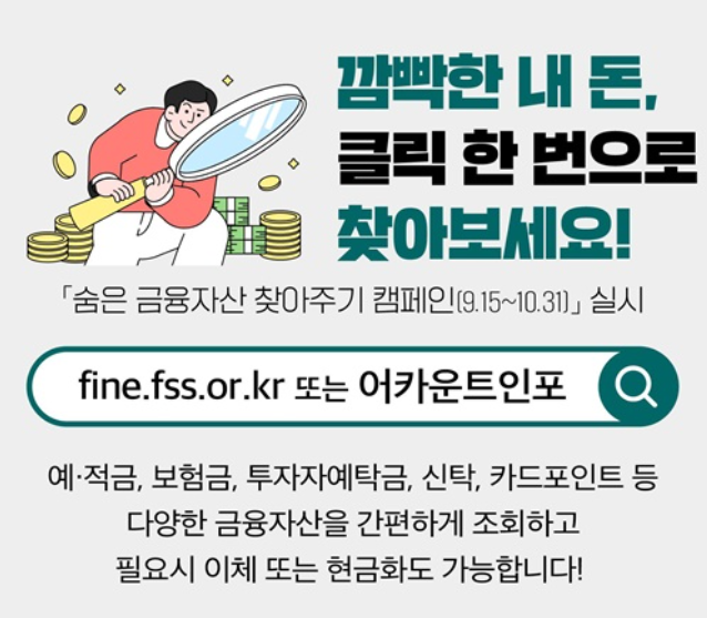올해도 진행되는 금융자산 캠페인(9.15~10.31) 기간을 활용해, 깜빡한 내 돈을 되찾는 기회를 놓치지 마시길 바랍니다.