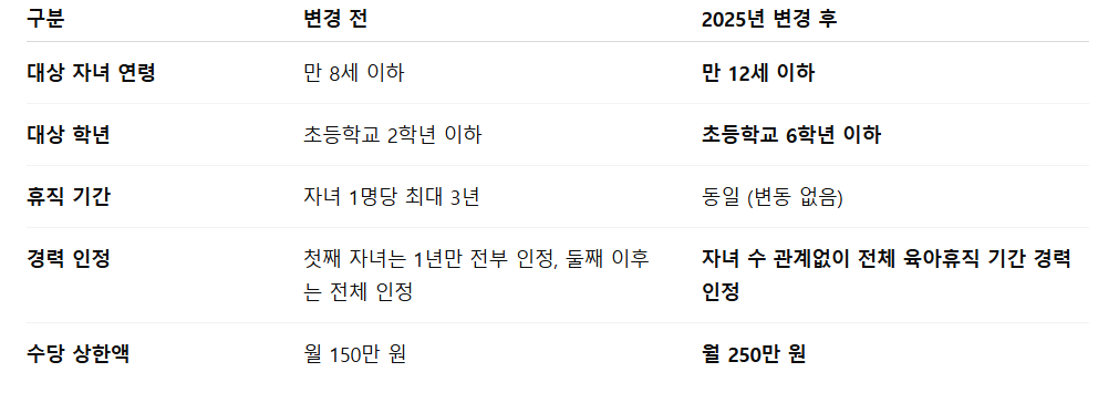 기존에는 초등학교 3학년 이상 자녀를 둔 부모는 육아휴직을 사용할 수 없었습니다. 그러나 2025년부터는 초등학교 6학년까지 확대되어, 자녀의 학업과 생활 관리가 필요한 시기까지 부모가 직접 돌볼 수 있게 됩니다.