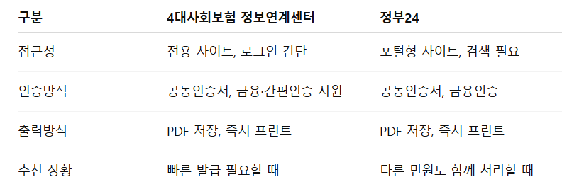 가장 많이 이용되는 경로는 4대사회보험 정보연계센터입니다. 정부24에서도 가능하지만, 전용 사이트가 더 직관적입니다.