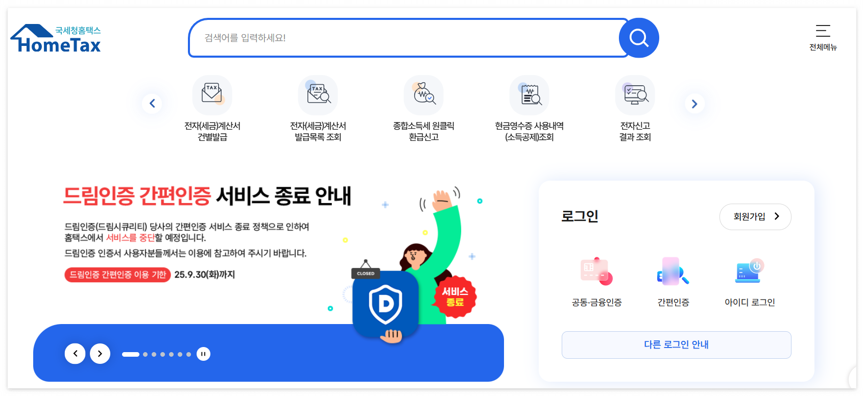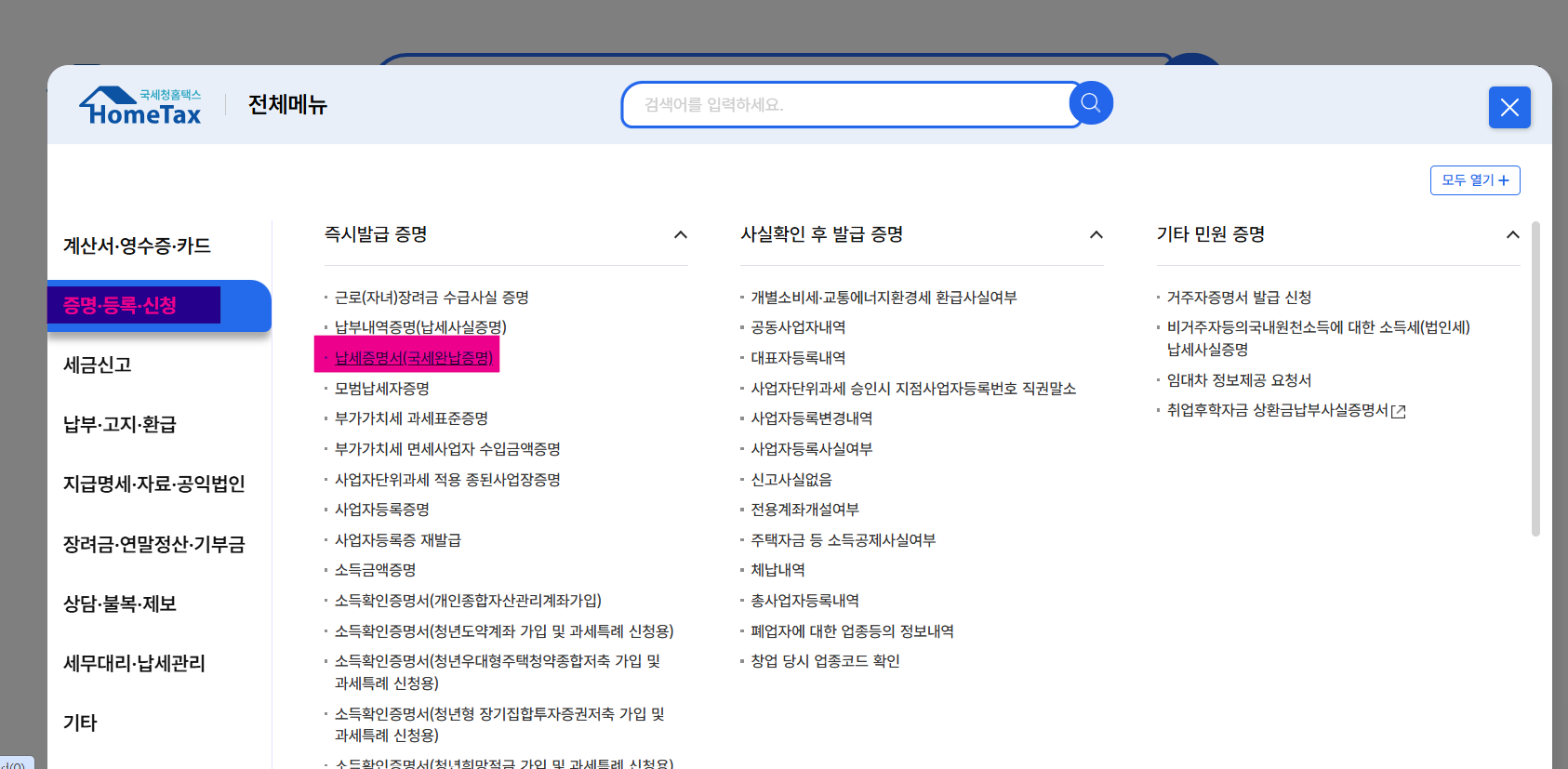 국세납세증명서 인터넷발급 절차 (홈택스 기준)