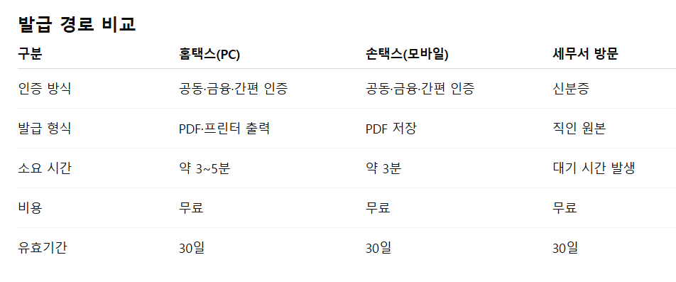 → 국세청 앱 ‘손택스’에서도 동일하게 발급 가능. 다만 모바일은 출력보다는 PDF 저장 중심입니다. - 기관별 요구사항 확인