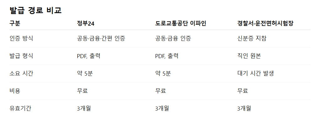 하나는 정부24, 다른 하나는 도로교통공단 이파인입니다. 두 서비스 모두 무료이며, 소요 시간은 3~5분 정도로 길지 않습니다.