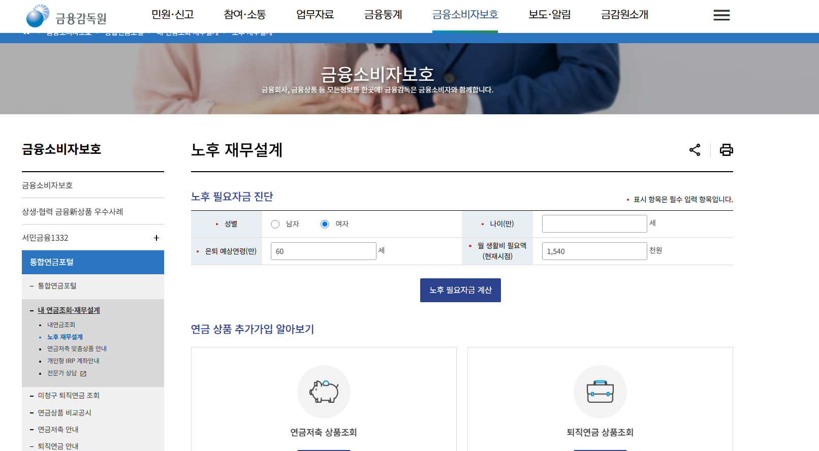 소득·지출·자산 정보를 입력하면 은퇴 후 필요한 자금 대비 보유 연금액을 계산해줍니다.