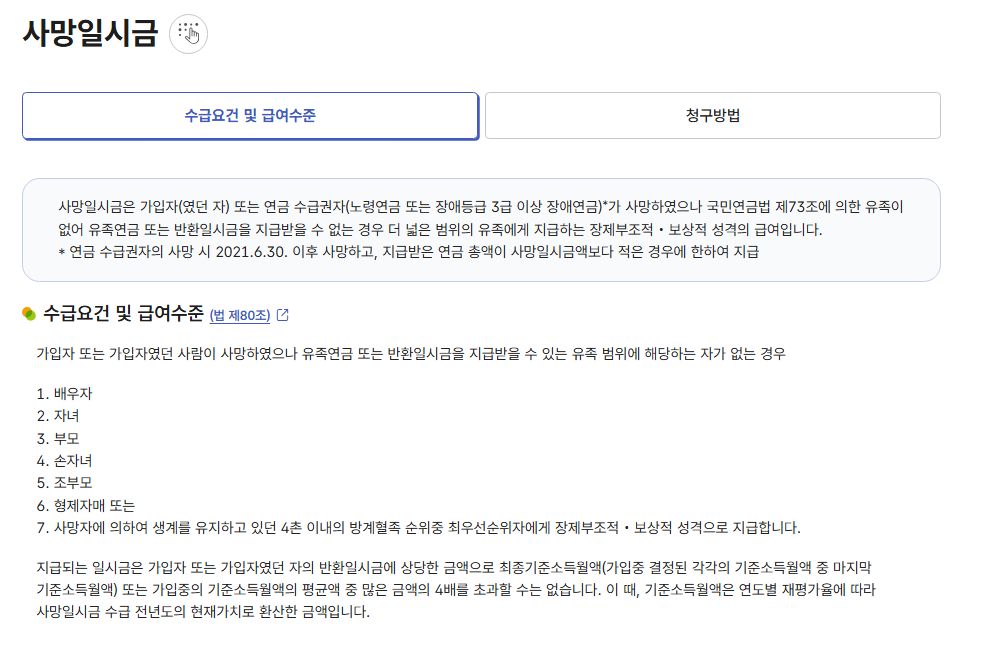 사망일시금은 국민연금 가입자나 연금 수급자가 사망했을 때, 유족연금 대상자가 없는 경우 지급됩니다. 이는 남은 가족에게 최소한의 생활보전을 위한 제도입니다.